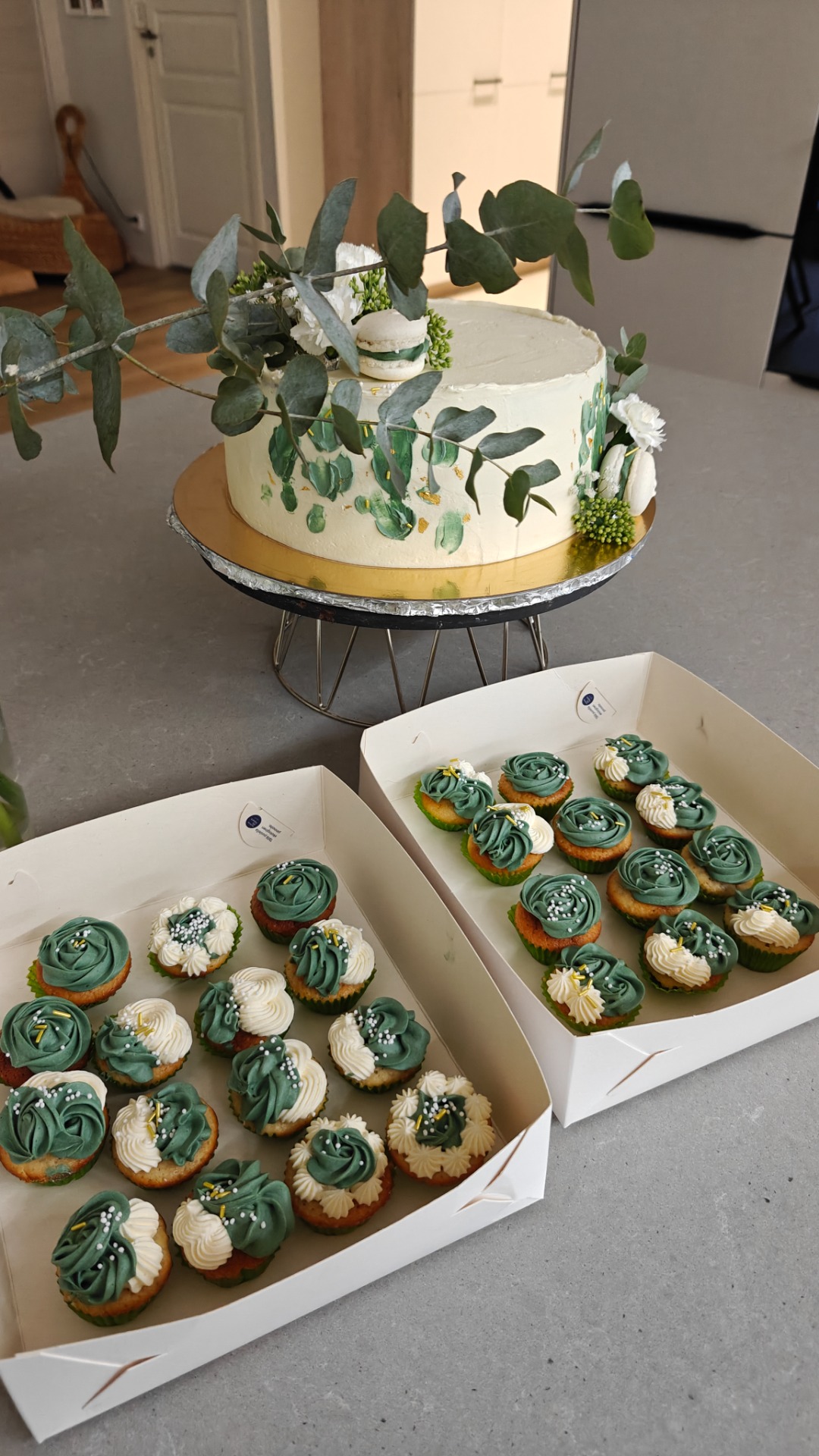Kauniit kreemipursotuksin ja nonparellein koristeltut minikuppikakut. Kuorrutuksen väriä saa toivoa.